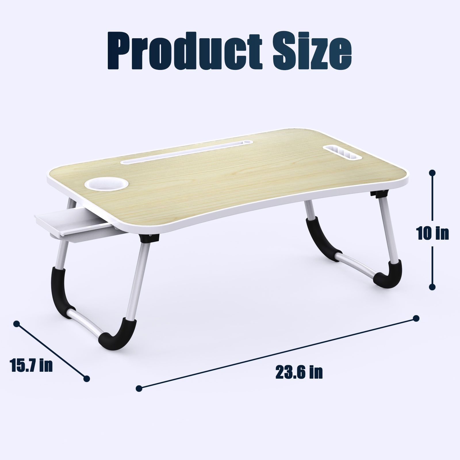 5.Large Size Desktop: The dimensions (LxWxH) of this table when opened are: 23.5x15.7x10 inches. The tabletop can accommodate a large-sized laptop, a mouse, notebooks, tablet, cup, cellphone, and other items. The leg space is also spacious enough, making it suitable for people of various body sizes and age groups to use.