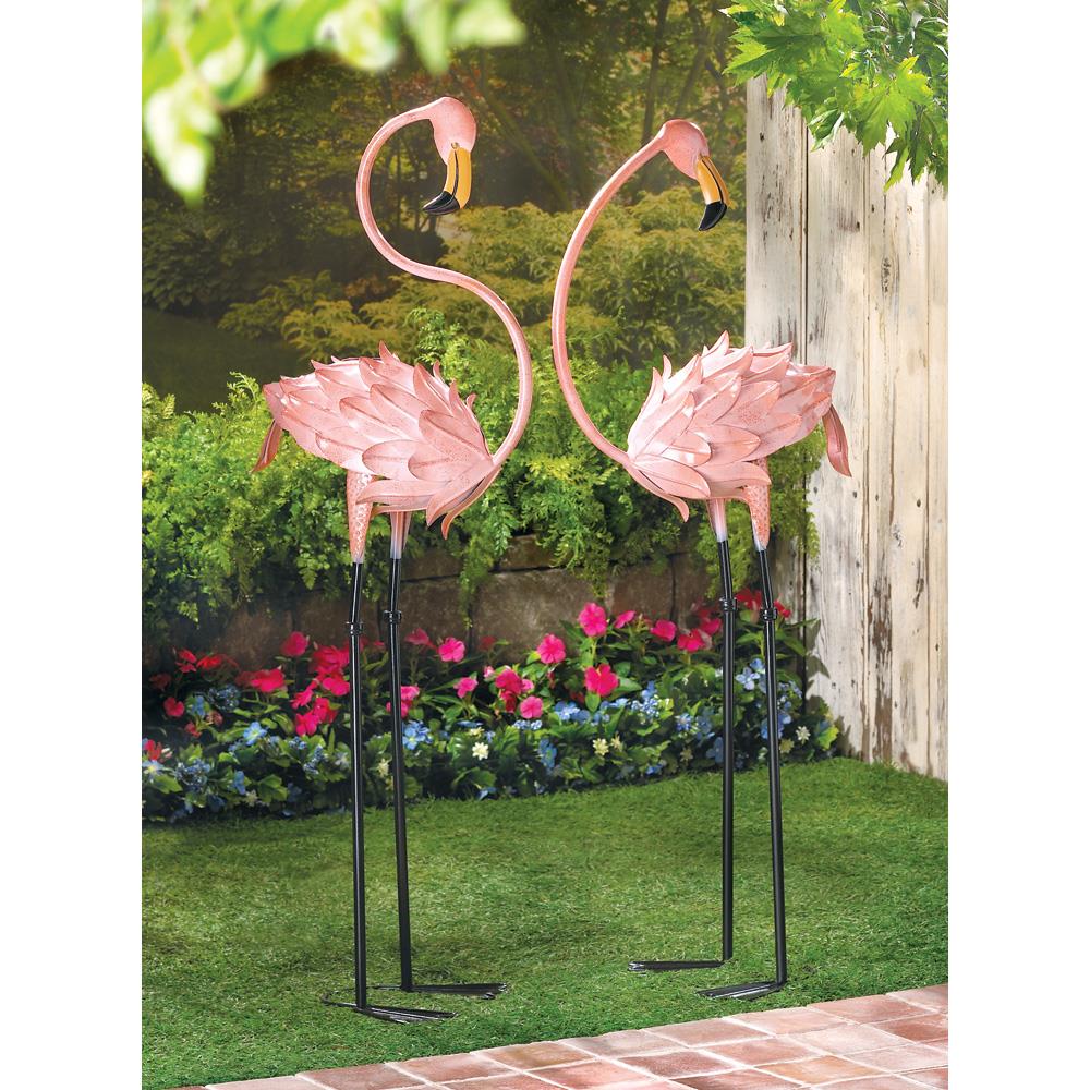 • Brighten your favorite space with a luscious touch of the tropics. These life-sized metal flamingo sculptures make a colorful splash that's a pure delight.