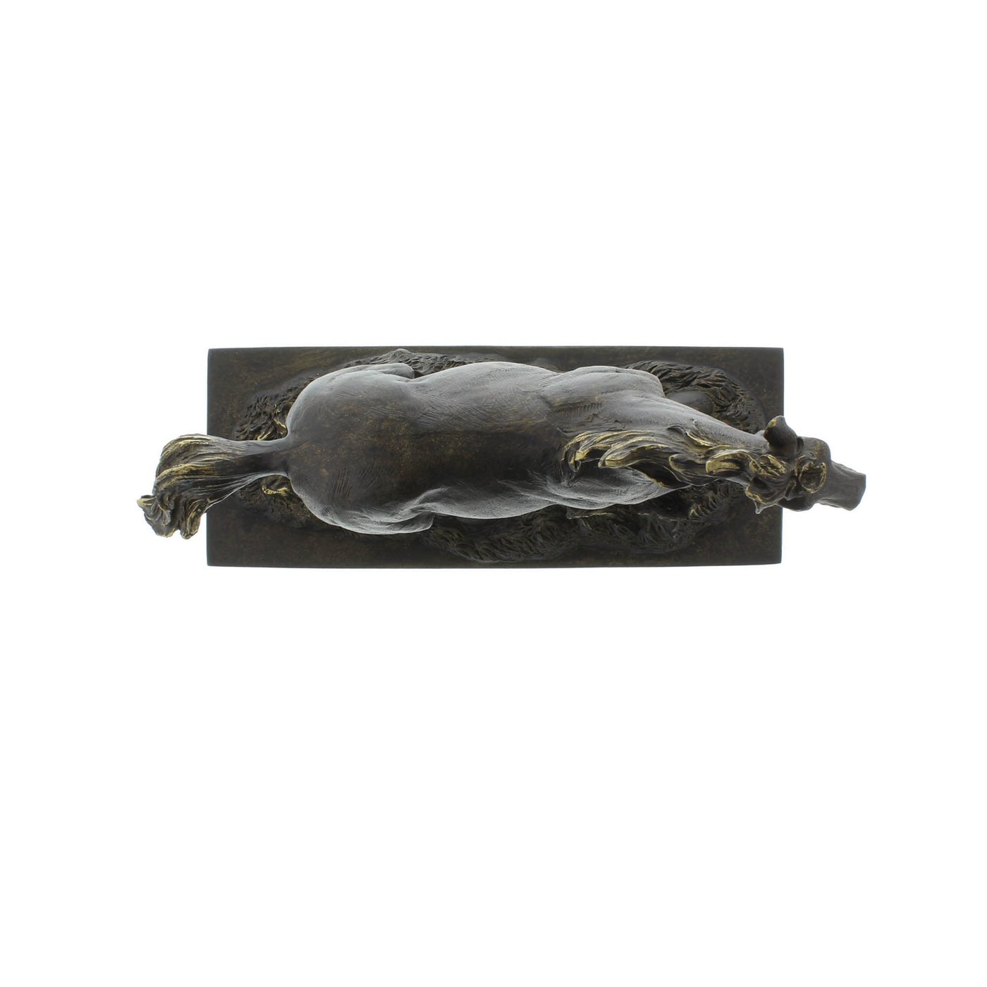 • There is nothing like the grace and strength of a running stallion. Captured in mid stride in a meadow, this bronze colored beauty will be perfect rustic addition in any room.