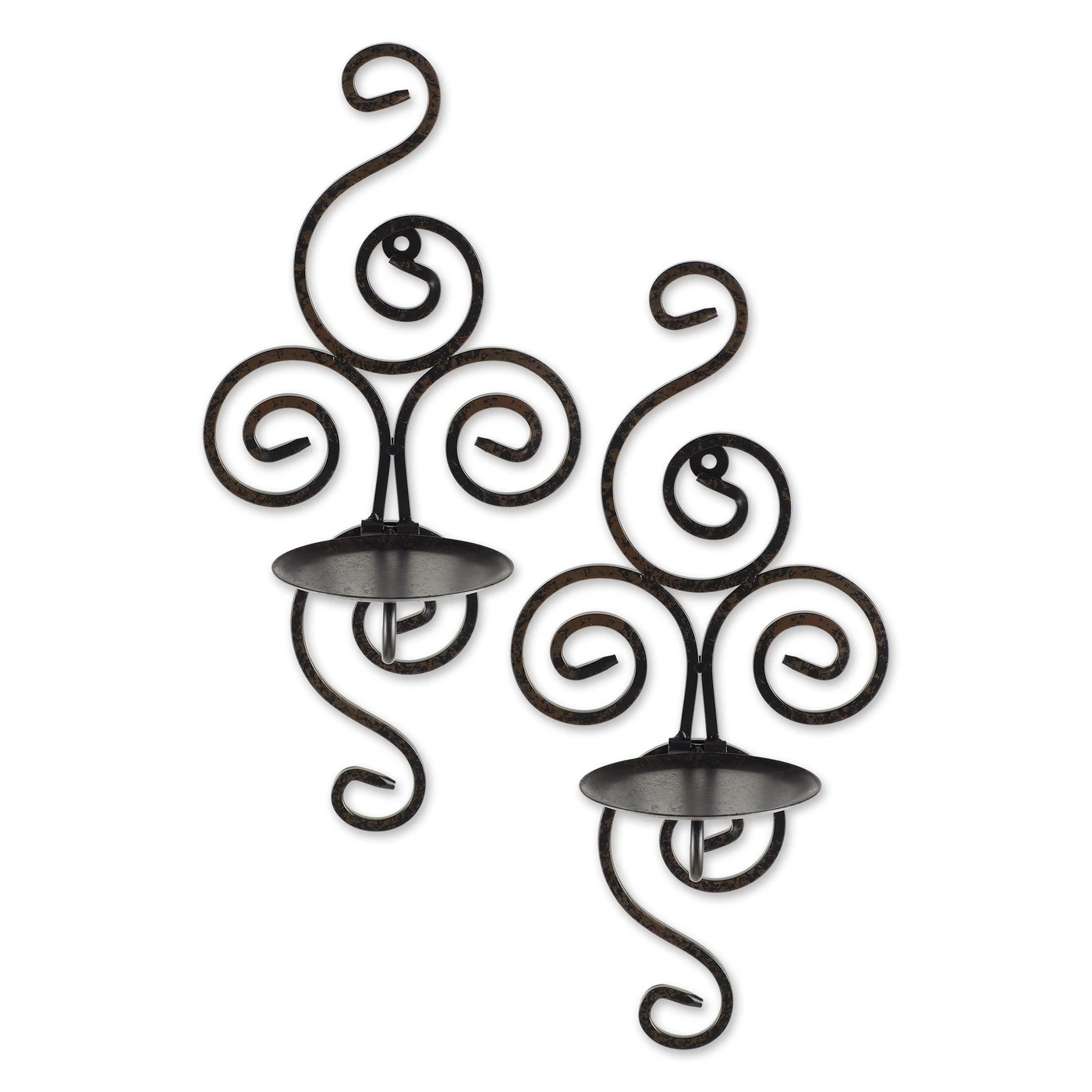 • Wrought-iron wall sconces feature a hypnotic “twirl” design that perfectly compliments the flickering candlelight.