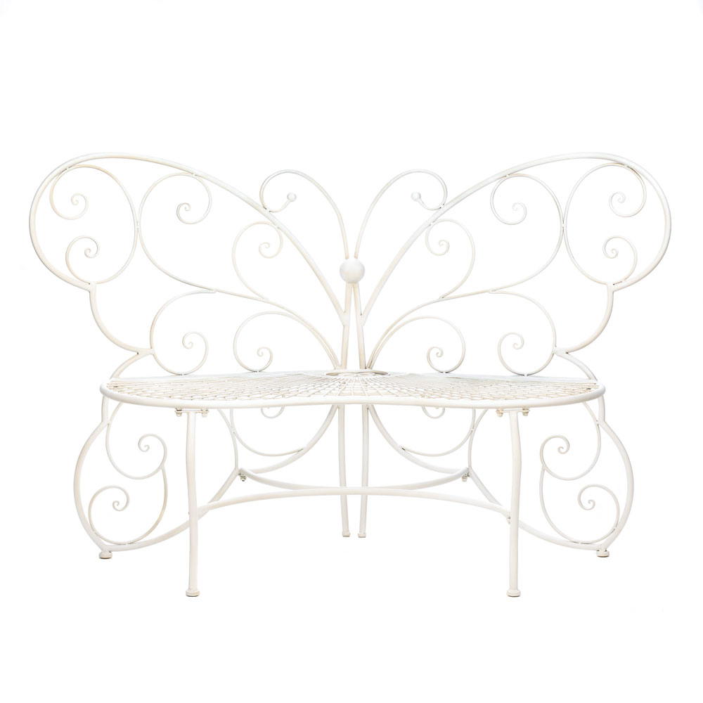 • Your garden can become a relaxing oasis with help from this beautiful butterfly bench. Featuring white painted iron shaped into a delicate butterfly, this bench is in shady spot under a tree or along a garden path for a place to relax and enjoy nature. Or sit side by side with a friend, sipping tea on a beautiful summer day. Max. weight limit: 440 lbs.