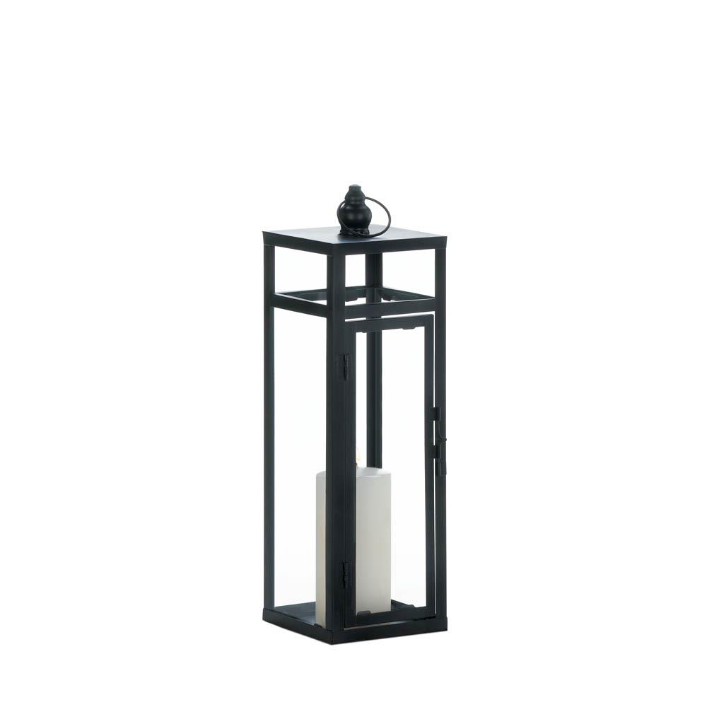 Don't let your favorite candle spend its time in an average candle lantern! This incredibly dramatic black metal lantern features a crisp, geometric design and clear glass to show off the shimmering candlelight. Weight 3.2 pounds. 5" x 5" x 17". Height w/loop; 18 1/2". Iron, Glass. UPC Number: 849179035419.