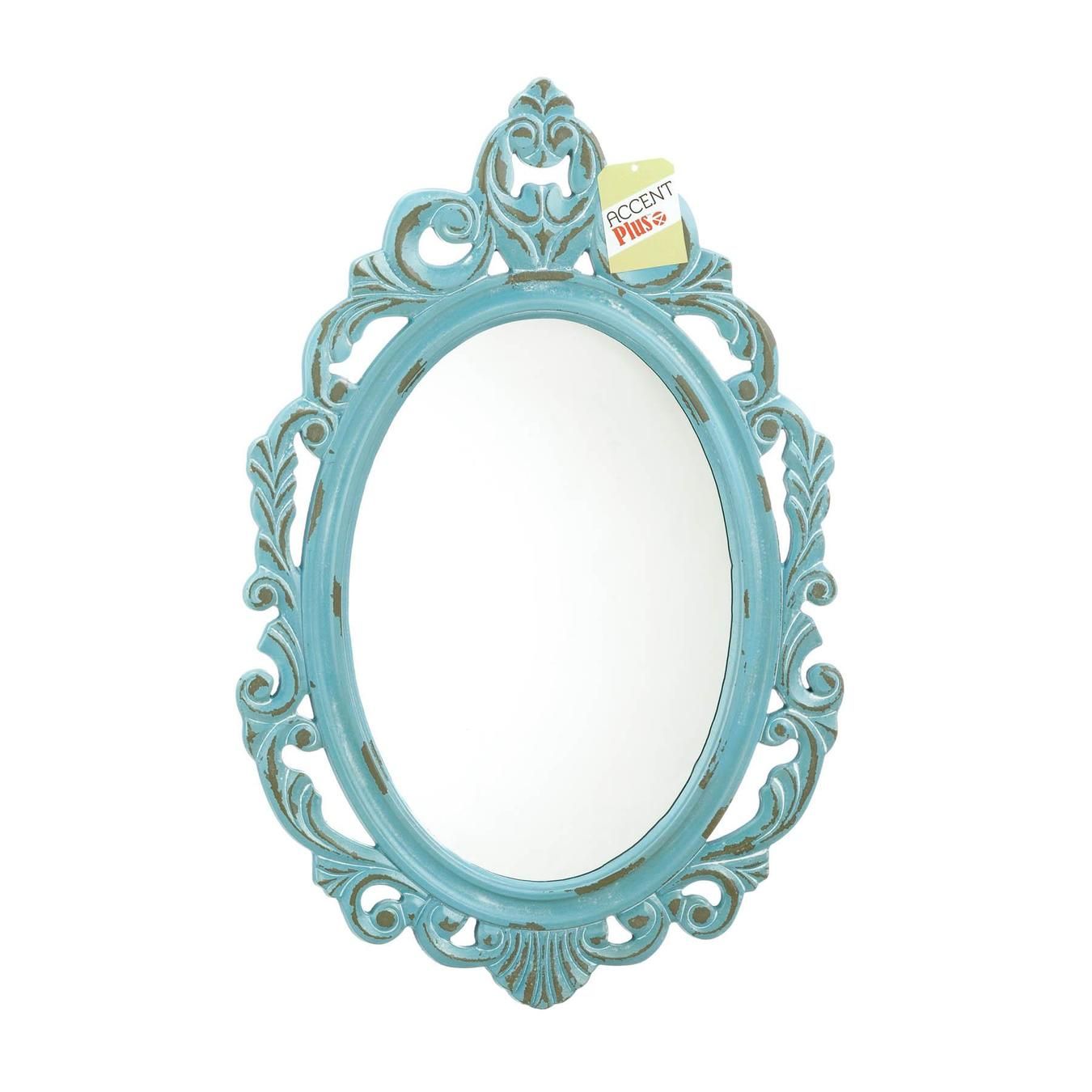 Add a pop of color to your walls and living space with this fun baby blue wall mirror. The mix of ornate design details and the modern blue color will add some flair to your bedroom, bathroom or entryway. Hang this mirror anywhere you choose. Triangle hook on back for hanging. Reflective mirror measures 9 " X 14" high. Weight 3.2 pounds. 15.5" x 0.5" x 23.5". MDF Wood, Mirror. UPC Number:849179042424.