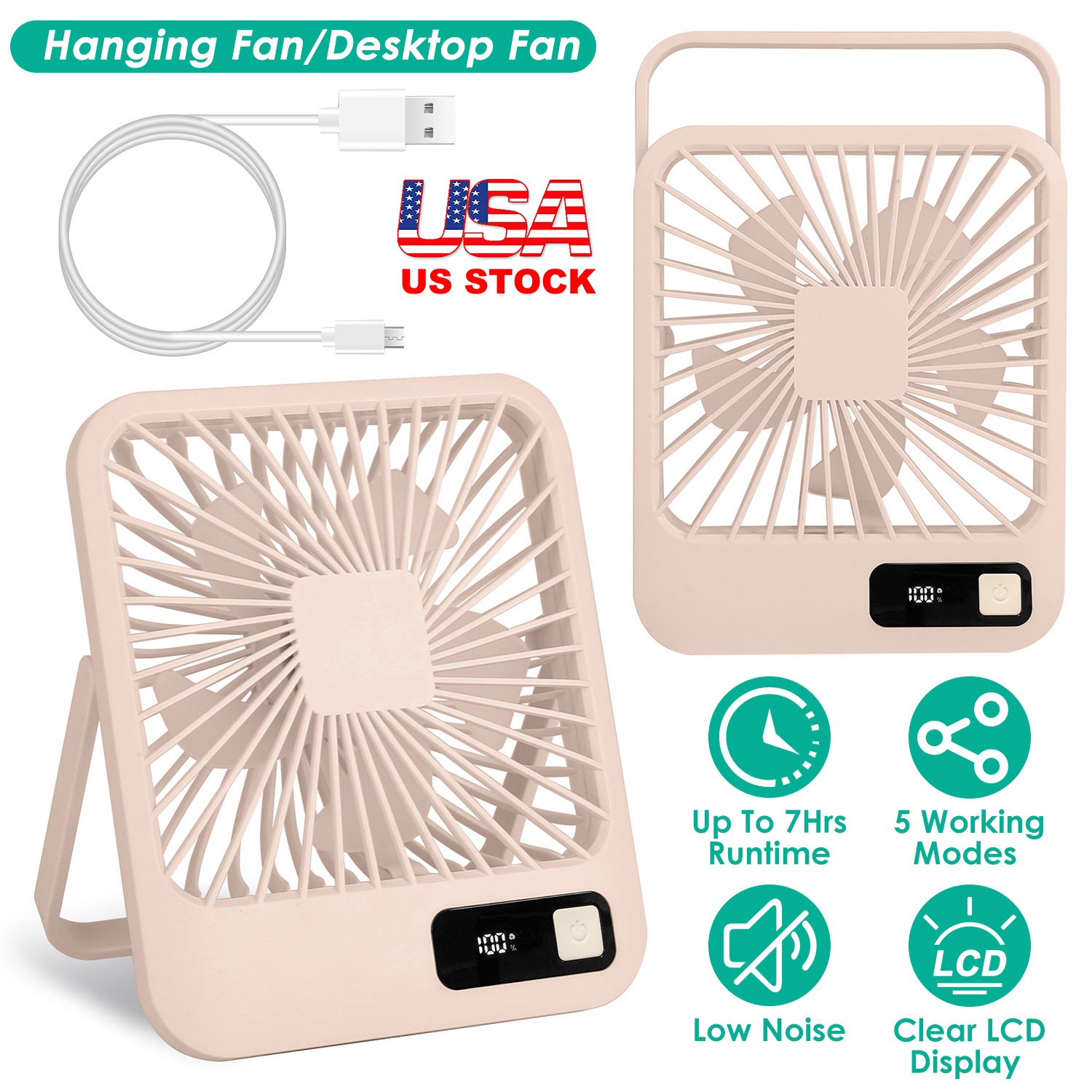 Getting too hot to sit at that desk of yours and wish you had some kind of breeze to help? Well now is your chance with this mini desktop fan. Just plug it into the USB port of your computer, laptop, or any other standard USB port from a hub or outlet and off you go! 5Pcs upgraded gull wing shaped fan blades create a cool breeze and balanced wind blowing to cool you off with 4 speed adjustment. The fifth considerate circulating modes bring you cool winds with variant speeds and no need to press the button frequently. 180 Degree rotatable bracket enable you to put you fan on the desk or hanging on the hook. LCD Display shows the remaining battery and let you charge the fan in time. Child safe use and quiet natural wind provides you endless cool wind in summer.